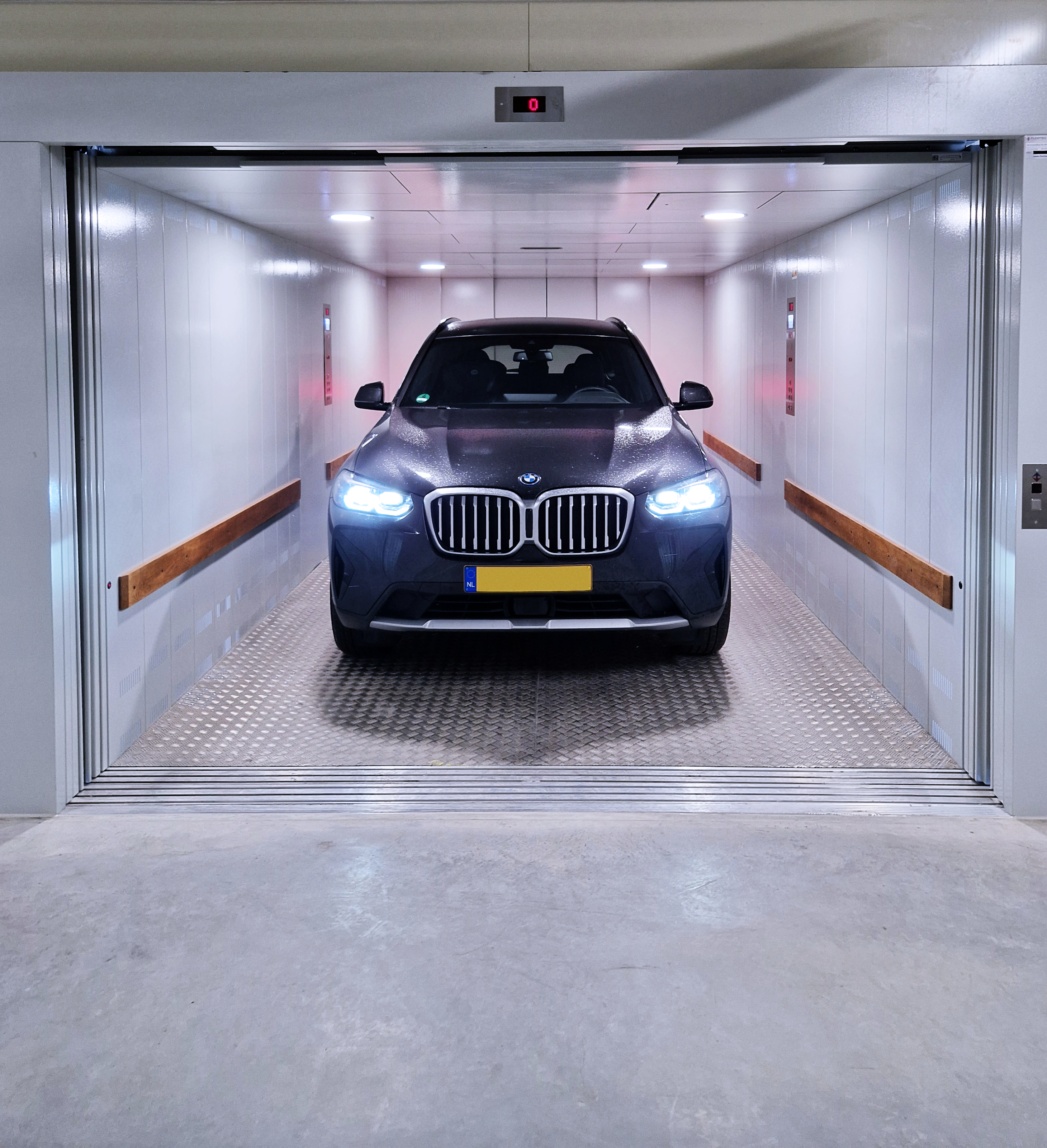The QHVe lift is our traction version for vertical transportation of vehicles and passenger in various types of facilities, such as residential buildings, offices, public parking, and other spaces where every meter of space is crucial. Additionally, this lift does not require a machine room and features a motor that maximizes energy efficiency. It offers the same customization options as our hydraulic range. Its speed is 1 m/s and load capacity is 6000 kg.